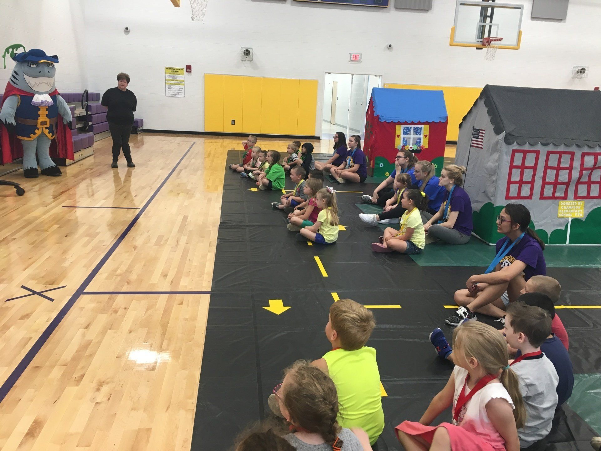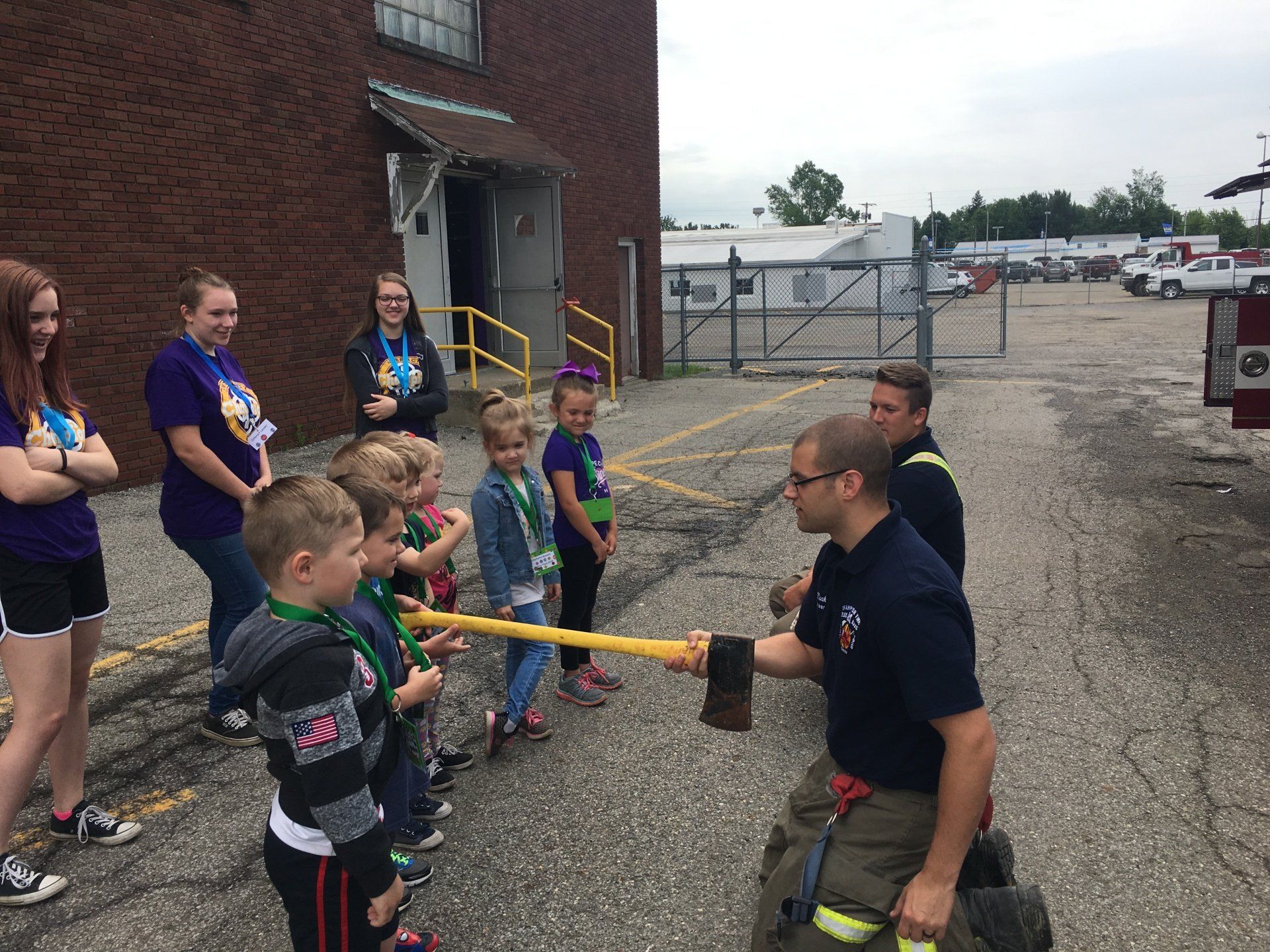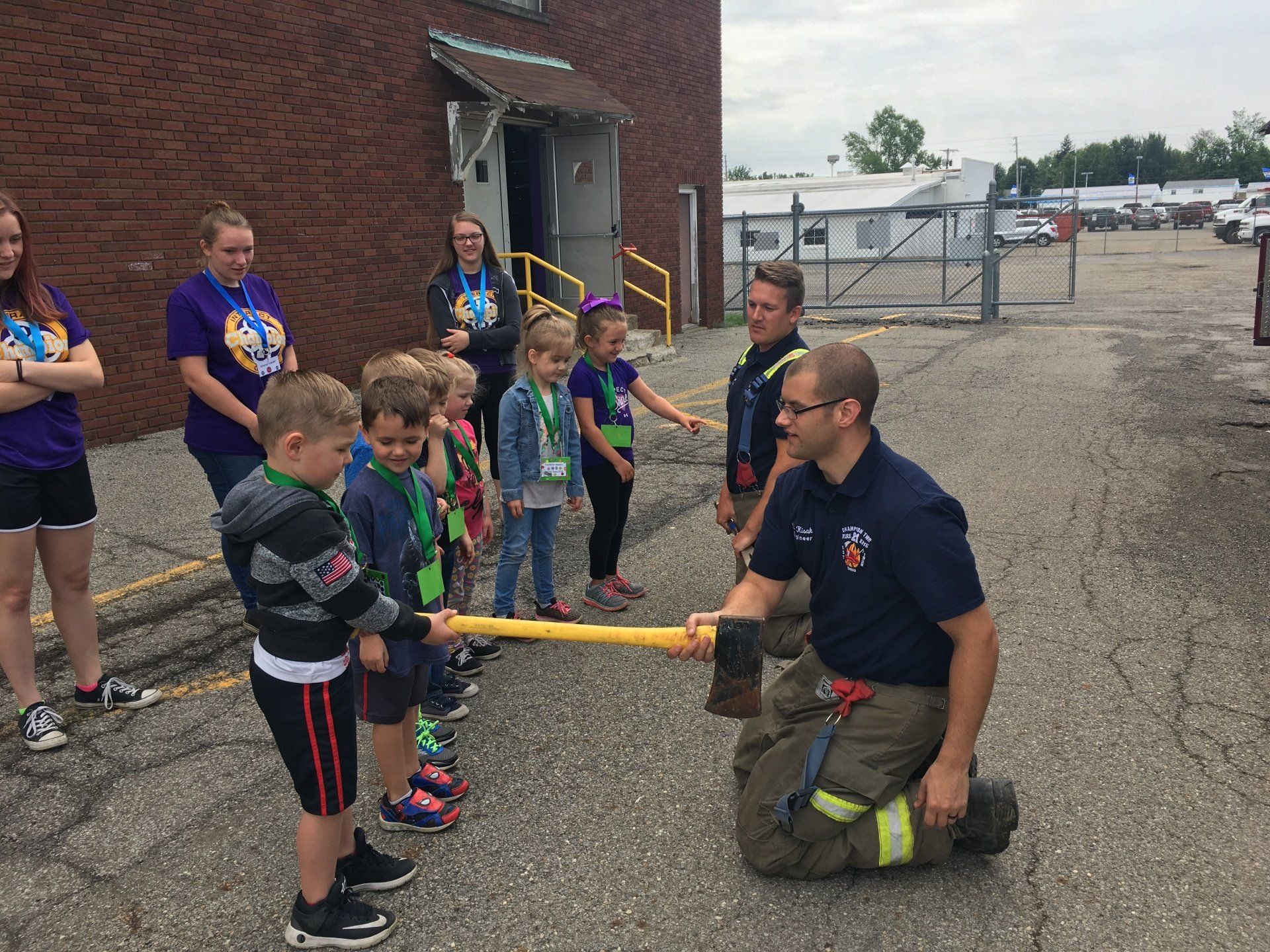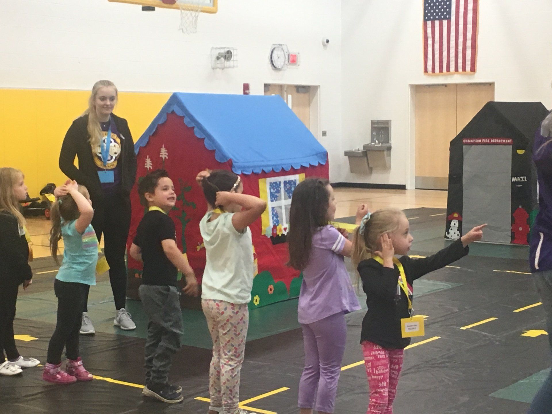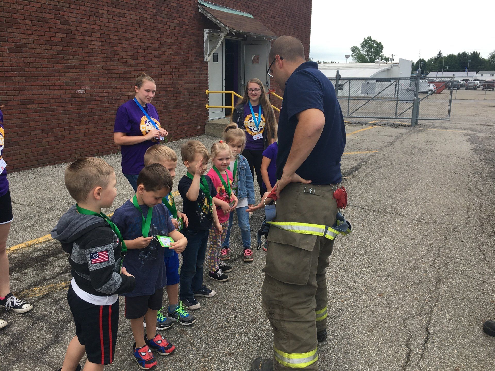 Champion Firefighters Stephen Kisak and Zach Walters visited Safety Town. Firefighters showed Safety Towners their safety equipment and their fire engine. They used the fog trailer to practice fire safety. The firefighters showed Safety Towners what they look like in their full gear. The firefighters taught Safety Towners lots of important rules for the entire family. The Safety Towners practiced their listening, driving and sharing skills in Safety Town. The Safety Towners worked on a fun craft.