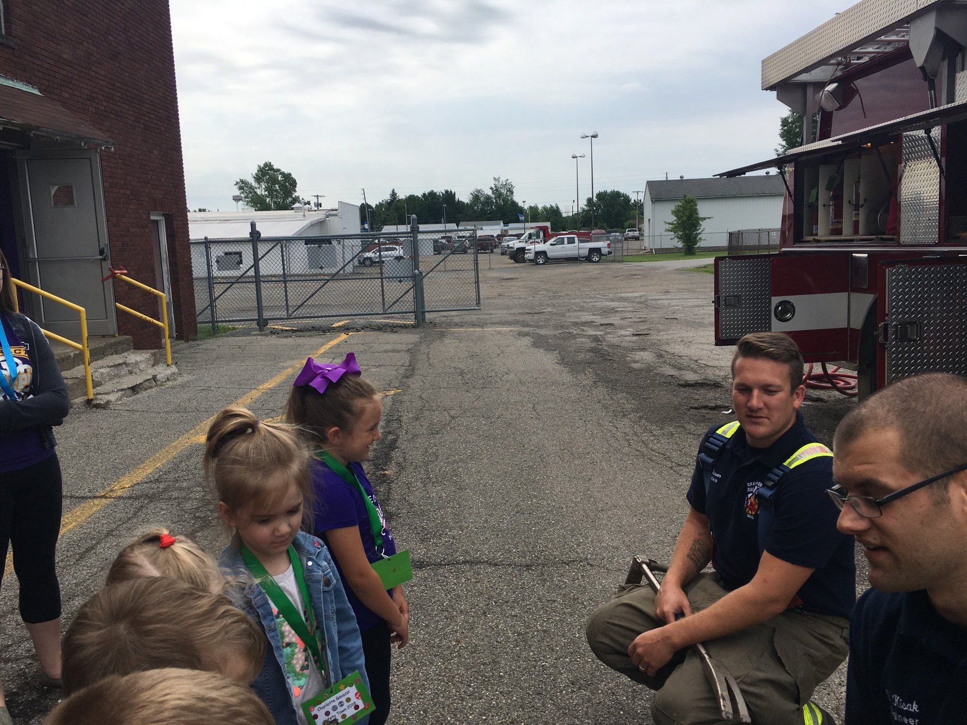 Champion Firefighters Stephen Kisak and Ben Glosser visited Safety Town. Firefighters showed Safety Towners their safety equipment and their fire engine. The firefighters showed Safety Towners what they look like in their full gear. The firefighters taught Safety Towners lots of important rules for the entire family. The Safety Towners practiced their listening, driving and sharing skills in Safety Town. The Safety Towners worked on a fun craft.